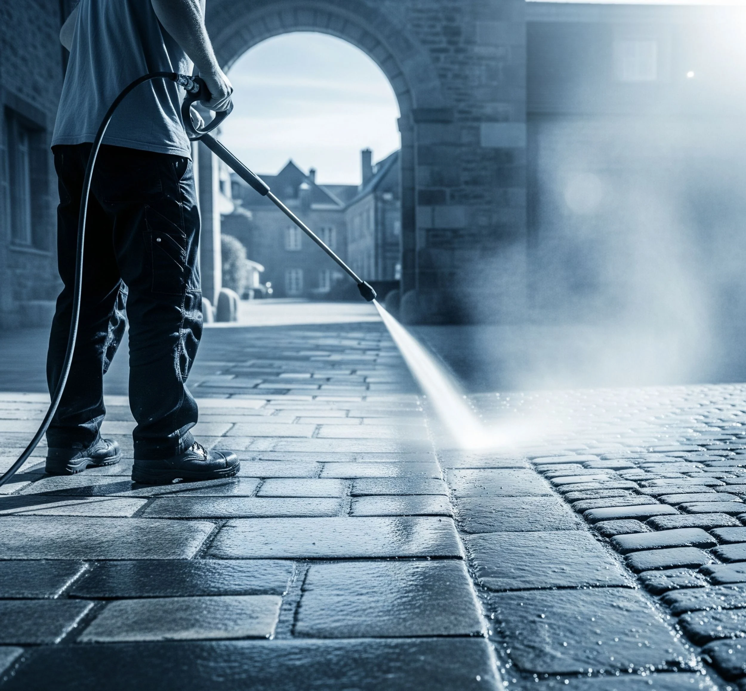 Ein grauer Schleier, Algenbewuchs und Unkraut in den Fugen beeinträchtigen nicht nur das Erscheinungsbild, sondern können langfristig Schäden verursachen. Wer jetzt selbst mit dem Hochdruckreiniger loslegt, riskiert falschen Druck oder unsachgemäße Bewegungen – und beschädigt die Oberfläche.